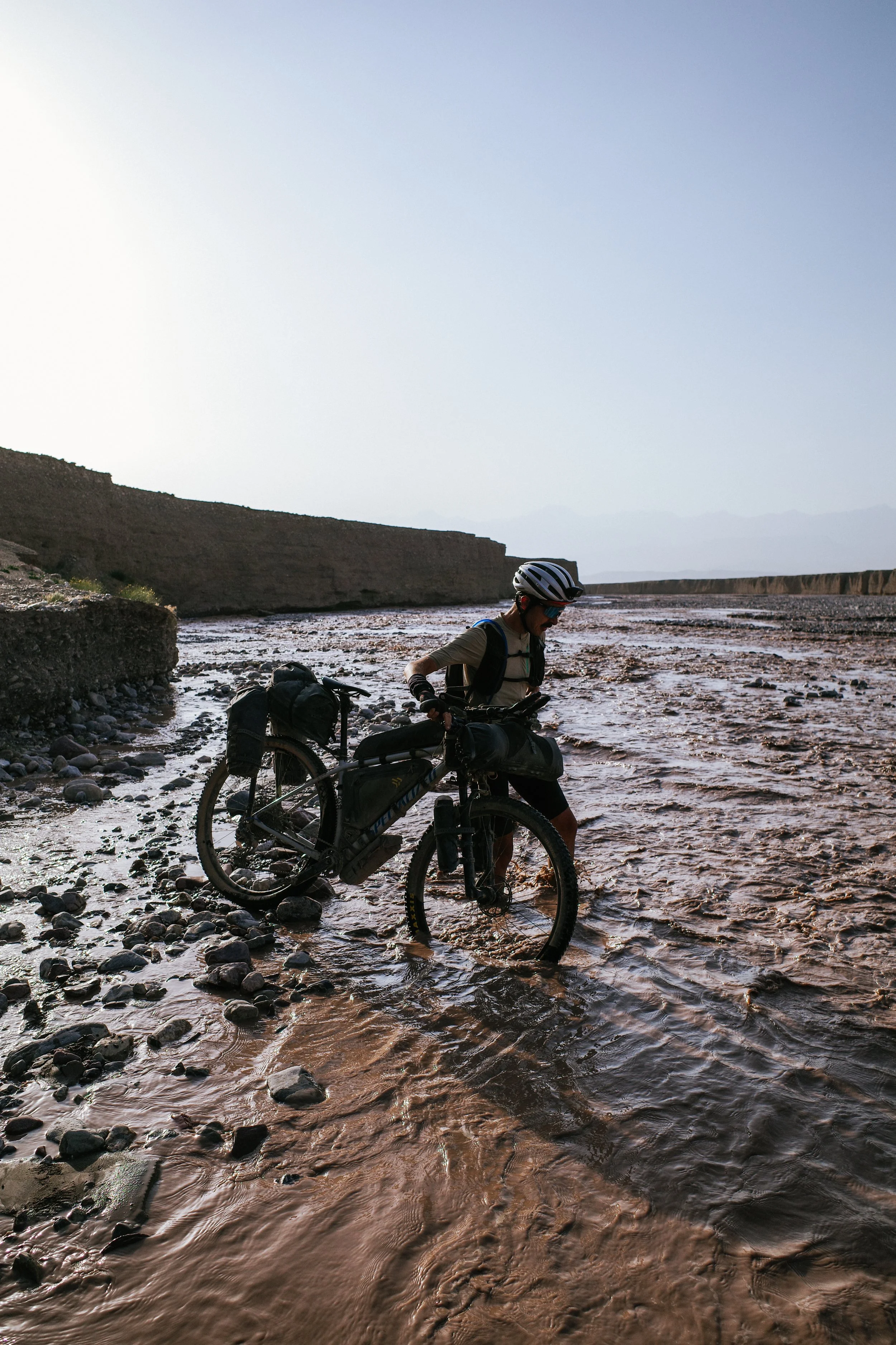 Fast forward, made it back to maybe 1000-1500m elevation, with some brutal head wind on the first tarmac part, the first shop with resupply appeared. I tried to be efficient as I knew there was a long stretch to some of the most insane river crossings coming. Definitely one of the most insane crossings I’ve ever done, while they were only going to be 3 or 4 I think we crossed like 7 and above knee deep, luckily I bought those 1euro crocks last minute, they were so helpful to not get wet feet but also pinched by rocks or any other thing that could be on the water. So yes I will sit down and change shoes nearly every river crossing unless I could see an easier stretch I could cycle on, I think only happened once. That day my goal was to try and get to the bottom of CP1 by daylight, and cross all this rivers not on the dark, after a while I realize everybody who was behind had to stay on the valley because it actually was pretty sketchy to cross those at dark without seeing where you were going or how deep was the water.